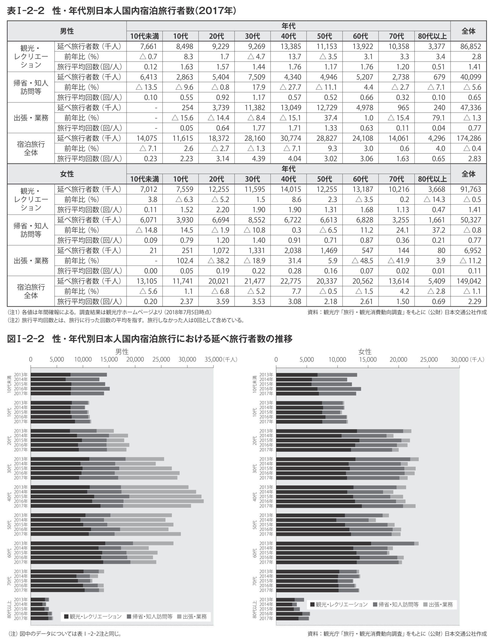 また、年齢別延べ国内旅行者数の図表から考えられることとして、レジャー目的での旅行者数は年齢別にそれほど開きはありません。ある程度所得が安定している層が旅行しやすい傾向にあり、コロナによる経済打撃によって中間層未満、それも子育て世代となるとますます余暇にかけられる予算が削減されるでしょう。一方、所得の時間もある高齢者層について見てみると、団塊の世代が75歳を超える、いわゆる後期高齢化社会に突入しますので、コロナ禍の有無にかかわらず減少傾向に入ることになります